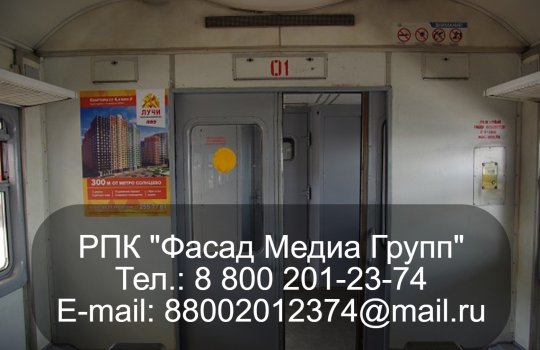 РПК «Фасад Медиа Групп» разместила рекламу в вагонах электричек. Рекламируется жилищный комплекс «Лучи». Период размещения рекламы составляет 3 месяца. Количество рекламных плакатов составляет 460 шт.