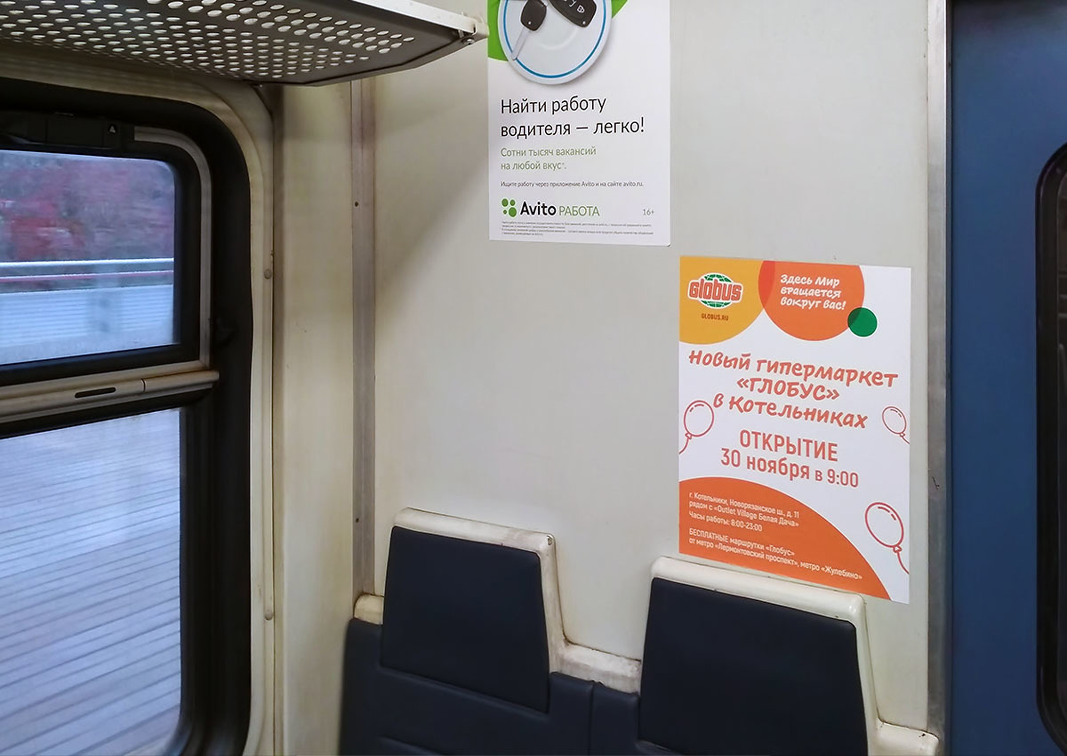 Рекламные стикеры в вагонах электрички на фото выше
